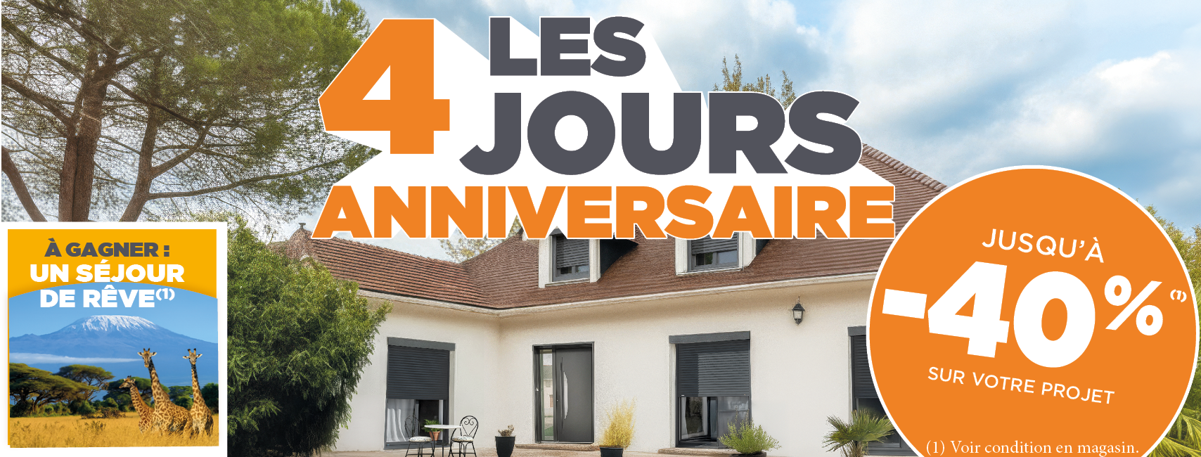 (1) Montant des remises différent selon les familles de produits : 15% de remise sur les escaliers et portes intérieures, 20% de remise sur les portes d’entrée, pergolas, portes de garage, carports et vérandas ; 25% de remise sur nos fenêtres, volets, stores, portails et clôtures ; 35% sur nos cuisines ; 40% sur nos dressings, façades de placards, verrières. Offres valables pendant l’opération « Les 4 jours Anniversaire » durant la période de promotion en cours pour l’année 2026. Tous nos prix sont conseillés TTC, départ magasin, les prix conseillés et remises ne s’appliquent pas sur les offres web du site internet. Les remises s’entendent applicables sur le tarif de référence conseillé Caséo TTC en vigueur. Hors Prestation de pose, offres exceptionnelles séries limitées et hors commandes antérieures. Offres réservées aux particuliers uniquement. Prix conseillés TTC valeur Janvier 2026, tenant compte de la remise indiquée, dans la limite des stocks disponibles. Les séries limitées ne sont pas concernées par la remise appliquée à la même famille de produit. Les séries limitées sont donc des prix fixes conseillés, hors pose, non remisés et TTC. Dans la limite des stocks disponibles, prix conseillés valeur janvier 2026. Prix conseillés TTC, éco participation comprise valeur Janvier 2026. Dans la limite des stocks disponibles.
